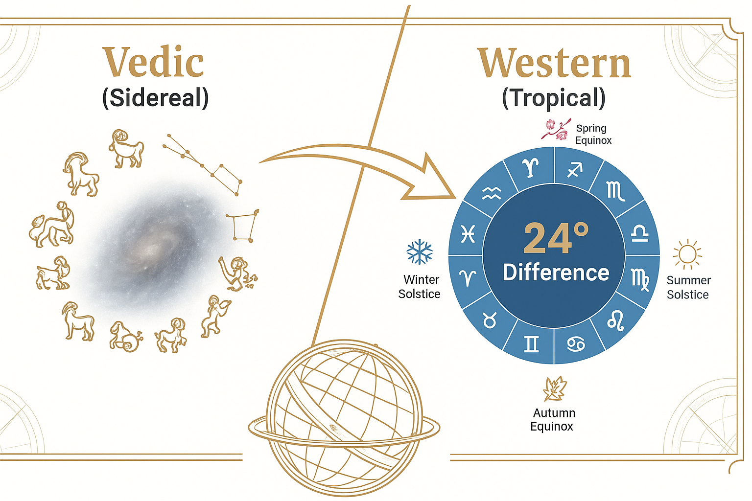 In short, the two systems start from different reference frames. Vedic astrology uses the sidereal zodiac tied to actual star backdrops, so each planet and zodiac sign is measured against visible constellations. Western astrology uses the tropical zodiac defined by seasonal equinoxes and solstices; over time, precession of the equinoxes shifted those seasonal markers away from the star groups.